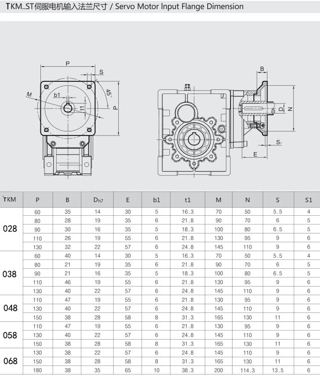 7.TKM系列雙曲面減速機安裝尺寸與NMRV系列蝸輪蝸桿減速器完全兼容(TKM28與TNRV050部分尺寸不同);